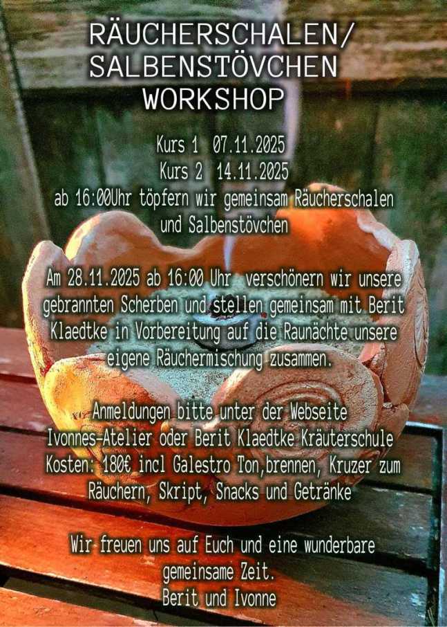 Nimm dir deine persönliche Auszeit vom Alltag, tauche mit uns in die Welt der Töpferwerkstatt ein, gestalte aus Ton dein ganz persönliches Unikat – vielleicht ein duftendes Kräuterstövchen oder ein anderes liebevoll gestaltetes Werkstück. An dem ersten Abend werden wir gemeinsam Töpfern durch zudem mit leckeren Köstlichkeiten verwöhnt, damit auch dein leibliches Wohl nicht zu kurz kommt. An einem Abend werden wir unsere gebrannten Scherben glasieren und verschönern. Hier wird Berit Klädtke Euch in die wundervolle Kraft der Kräuter in Vorbereitung auf die Raunächte mitnehmen.Ihr werdet Euch Eure eigene Räuchermischung zusammen stellen . Ein Workshop voller Natur, Kreativität und Genuss! Der Töpferkurs ist auch als Geschenkgutschein erhältlich.
